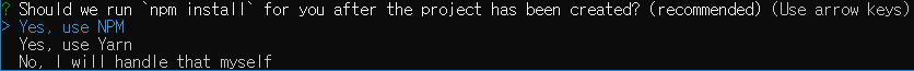 - Should we run `npm install` for you after the project has been created? (recommended) 이후 해당 프로젝트내에서 모듈 설치시 사용할 명령어 선택