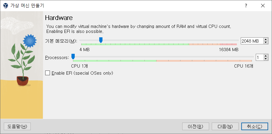 - 테스트 및 기본 설정용으로 사용할 예정으로 메모리는 2048MB, Processors 는 1개로만 설정한다