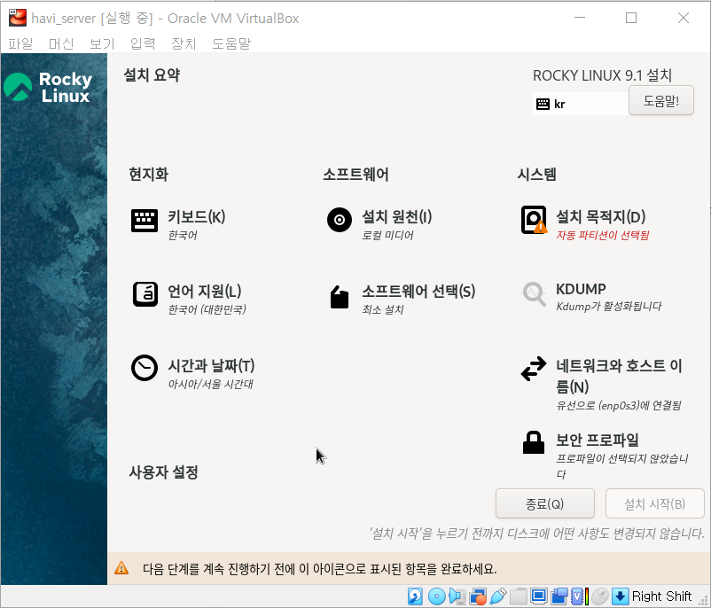 - 언어, 시간 날짜 확인 후 경고 표시 들어온 부분만 확인 후 [ 설치 시작 ]
