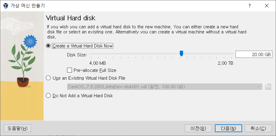 - Create a Virtual Hard Disk Now : 초기 기본 고정 하드 용량 / 설정한 만큼 이미지 파일이 해당 용량으로 잡힘