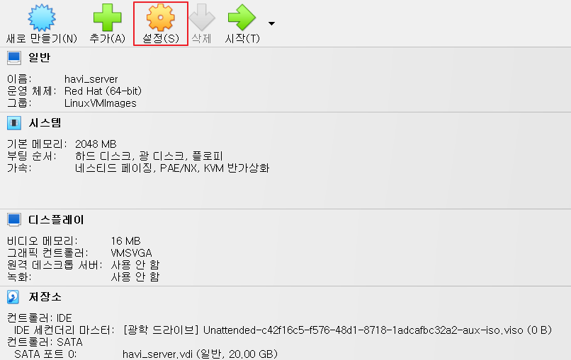 1) 해당 VM의 전원을 끈후 [설정]으로 접속